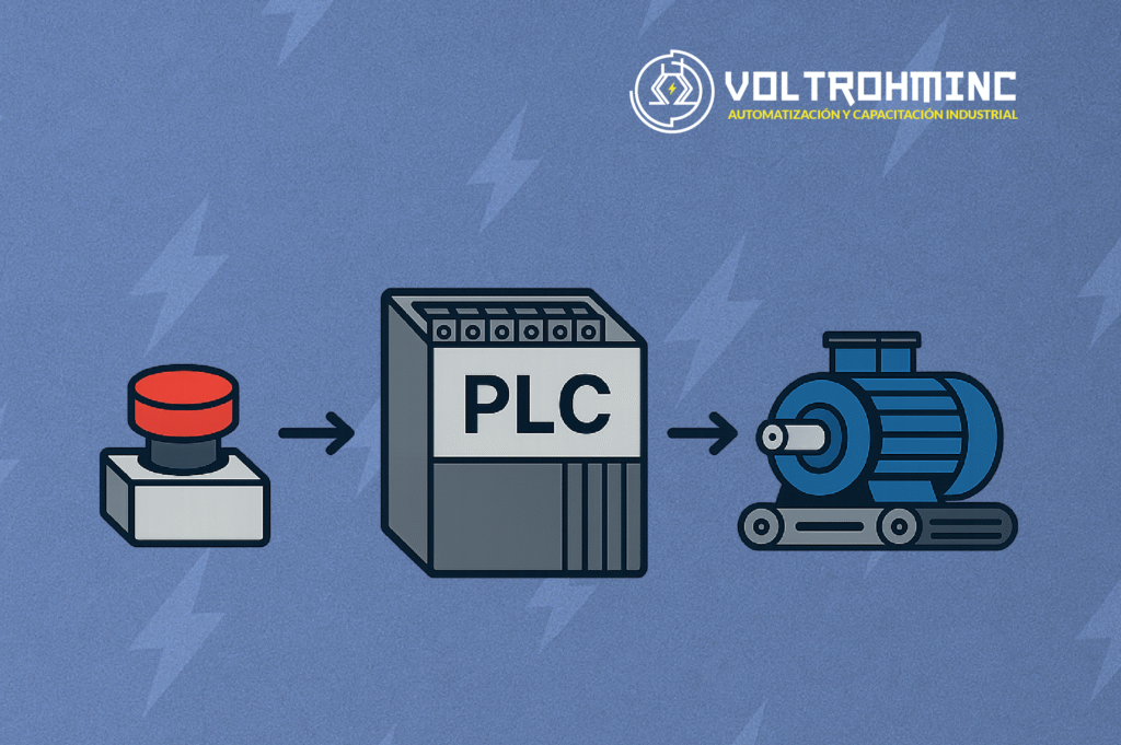 Por ejemplo: si presionas un botón, el PLC puede encender un motor, activar una banda transportadora o iniciar una secuencia.